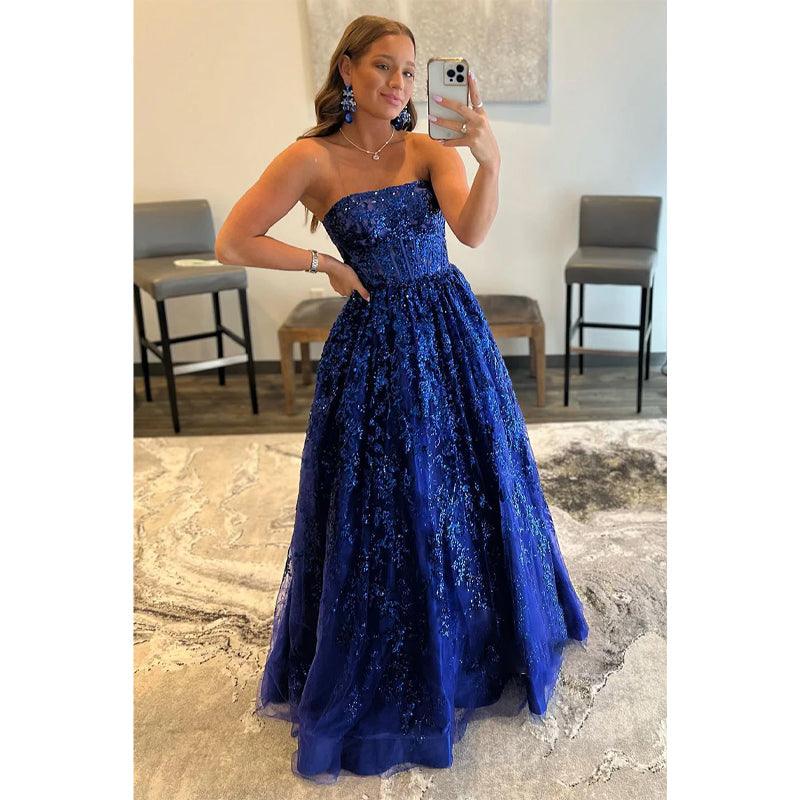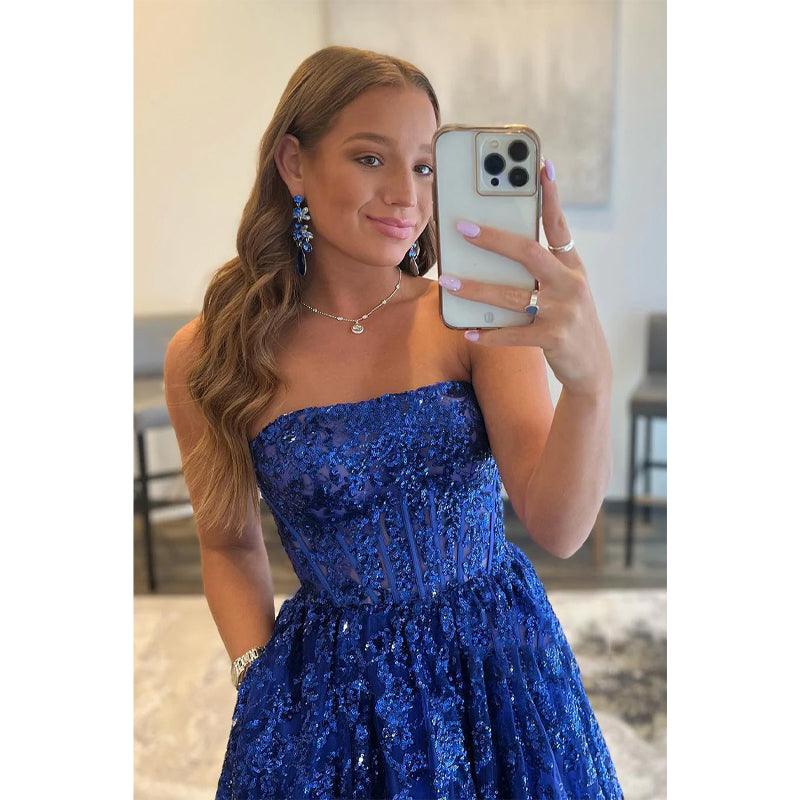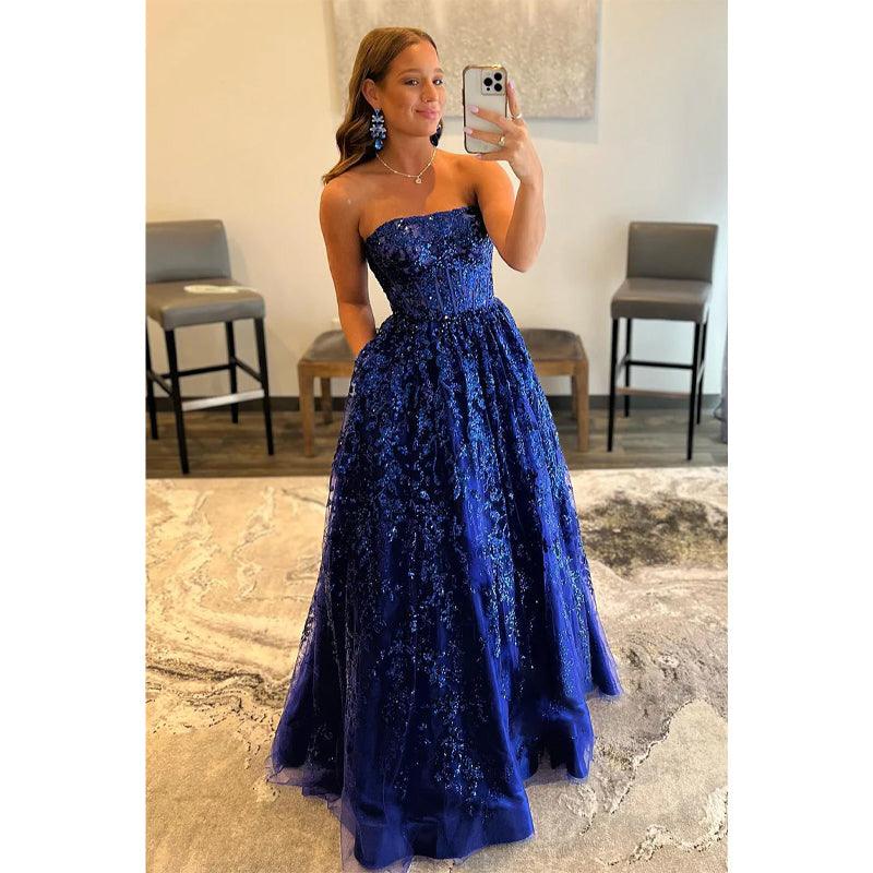 Vestido largo de fiesta de corte A, sin tirantes, con apliques de lentejuelas y bolsillos.