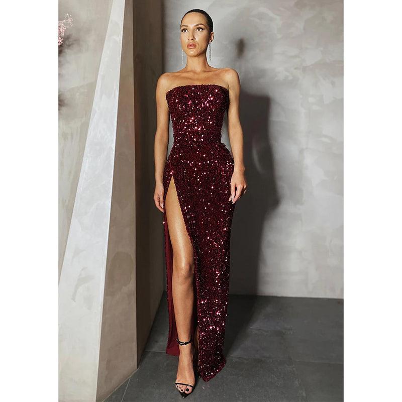 Vestido de fiesta de graduación brillante con lentejuelas, corte tubo sin tirantes y abertura lateral