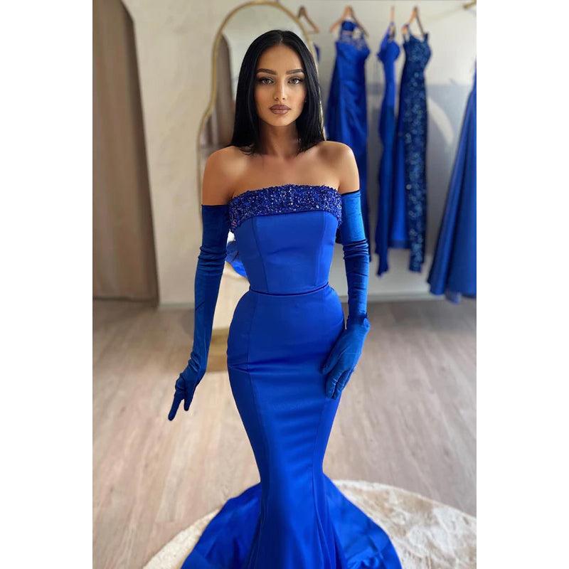 Vestido largo de noche de sirena sin tirantes, sin mangas, con lentejuelas y cuentas, de satén.