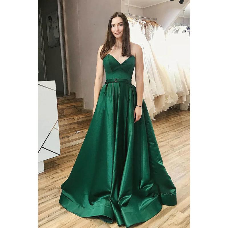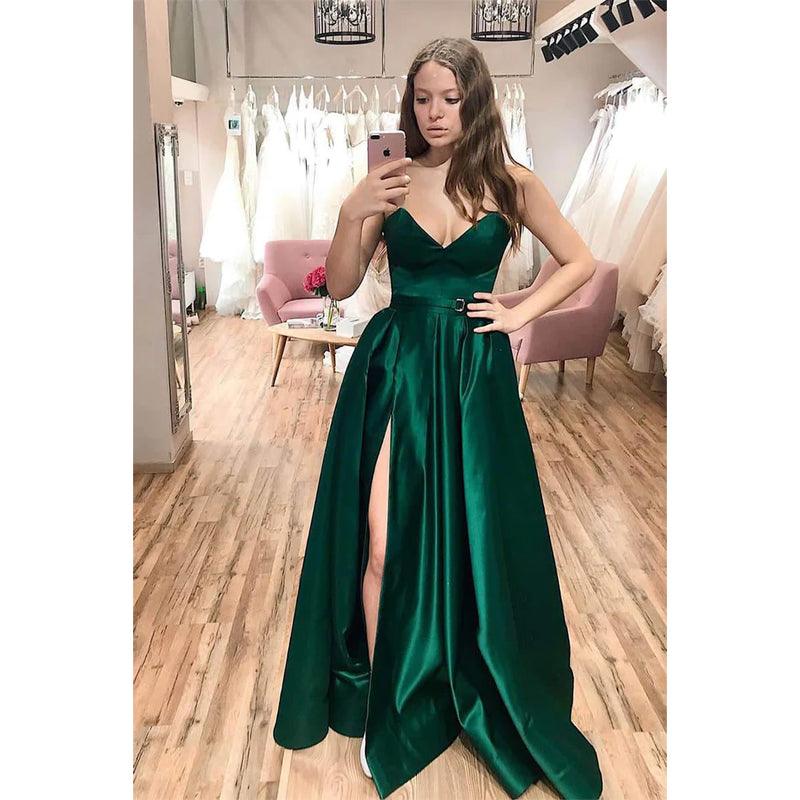 Vestido largo de fiesta sencillo, sin tirantes, de satén verde, corte en A, escote en V y abertura.