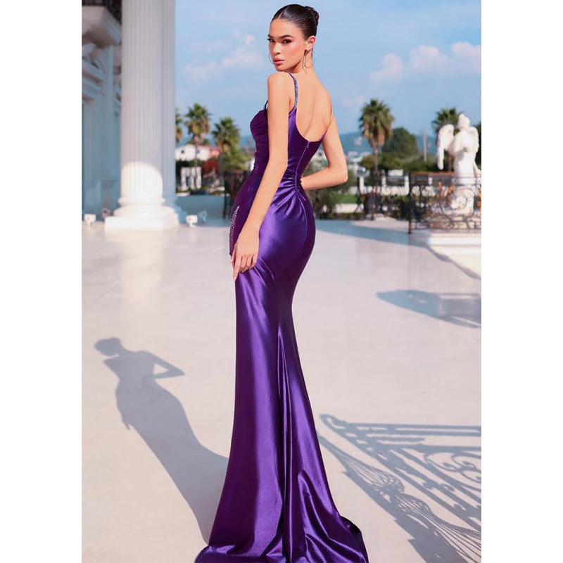 Vestido largo de fiesta con tirantes, satén morado, pliegues y abertura.