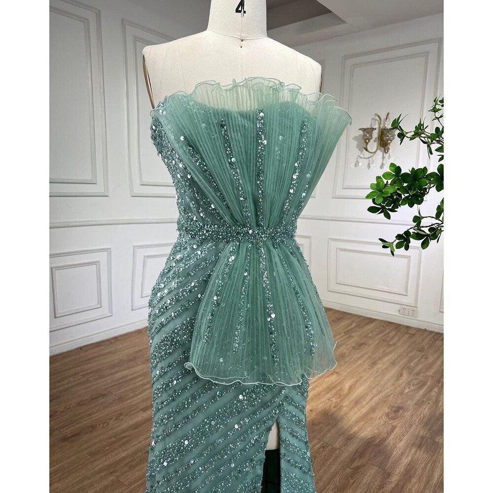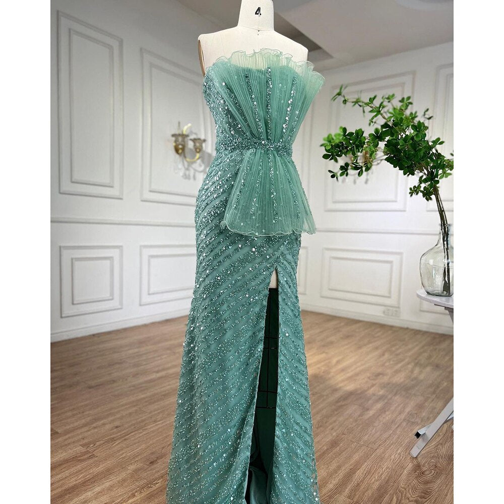 Impresionantes vestidos de noche de sirena turquesa con abertura alta y diseño de cuentas árabes para mujer, ideal para bodas LA72097