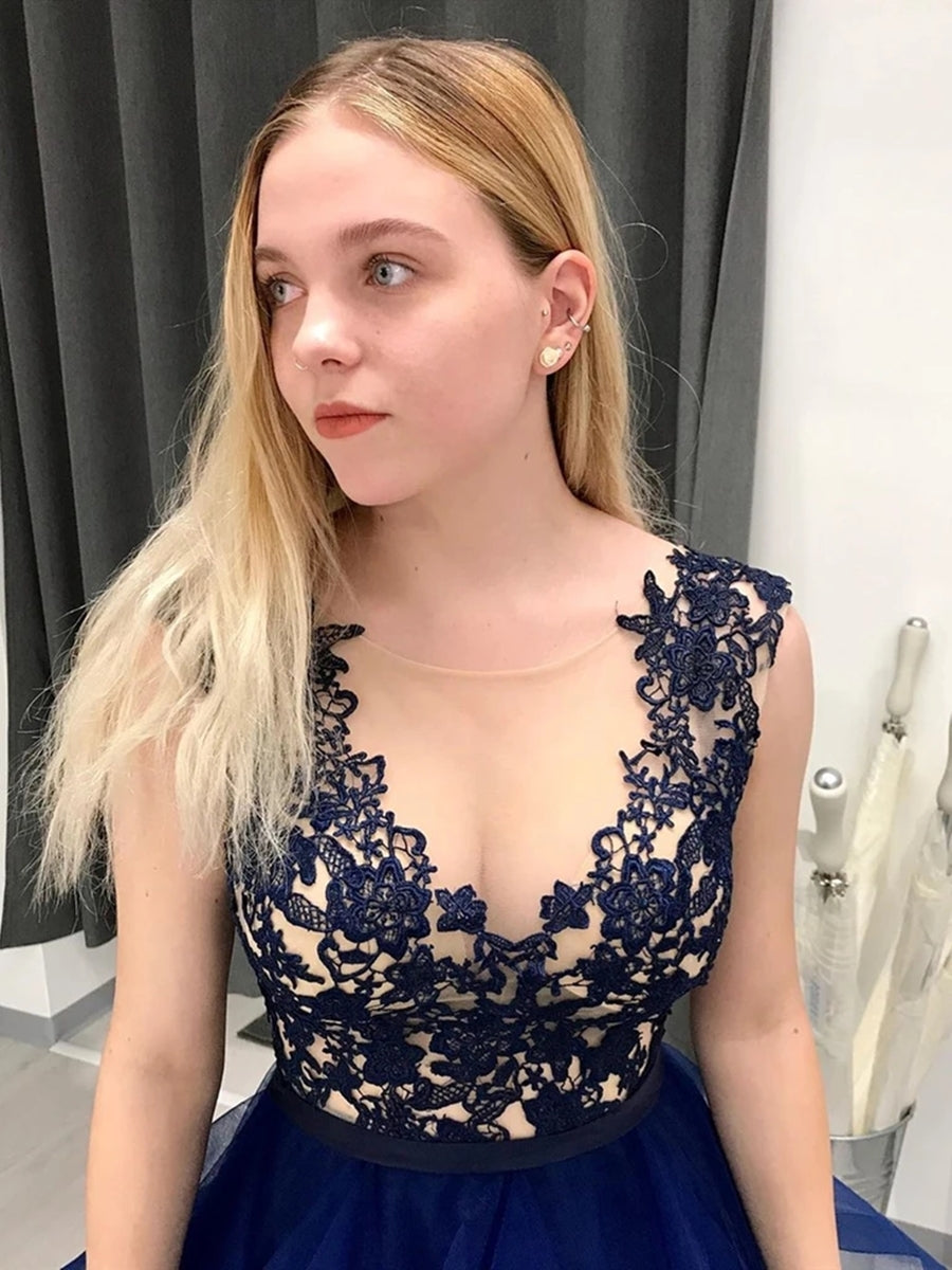 Vestidos largos de fiesta formales con encaje, escote en V, corte en A y tul esponjoso