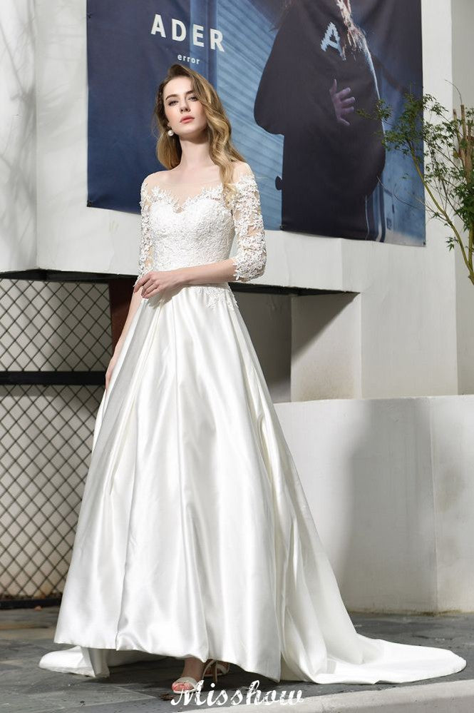 Catálogo: Vestidos de novia Código del artículo: B157491100065120 Espacios: Playa / Destino.Iglesia.Jardín / Salón al aire libre Detalles de la espalda: Con cordones Temporada: Primavera.Verano.Otoño.Invierno Escote: Joya Material: Satén.Tul Silueta: Línea A. Vestido de baile. Princesa Tipo de cuerpo: Señorita Tren: Tren de la capilla Largo de manga: Mangas de 3/4 Cintura: Natural Largo del dobladillo: Hasta el suelo Adorno: Encaje