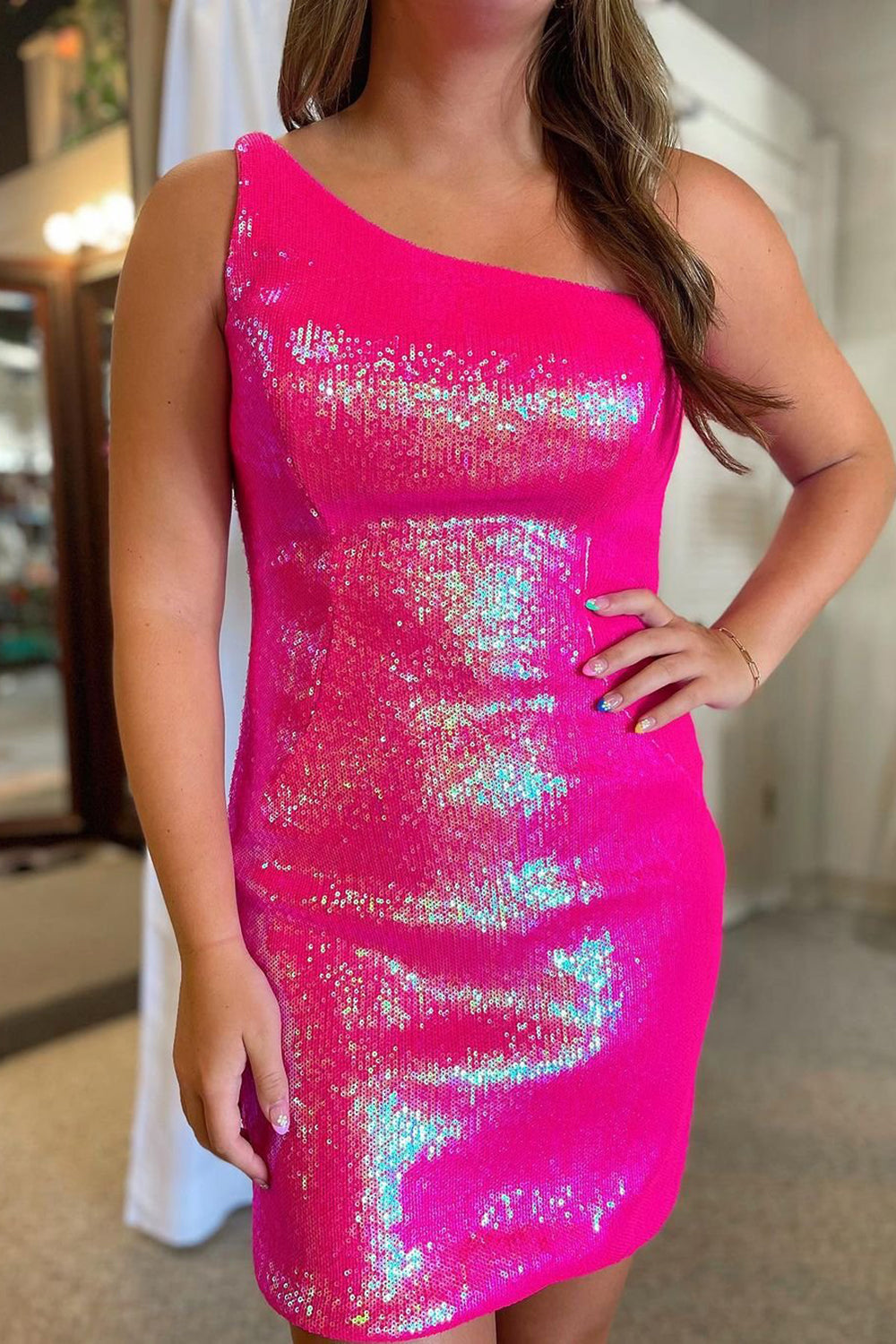 Vestido corto de fiesta Sweet Magic Sheath de un solo hombro con lentejuelas rosa intenso