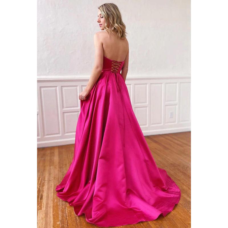 Vestido largo de noche de fiesta, corte A, sin tirantes, sin mangas, con cordones, de satén y abertura.