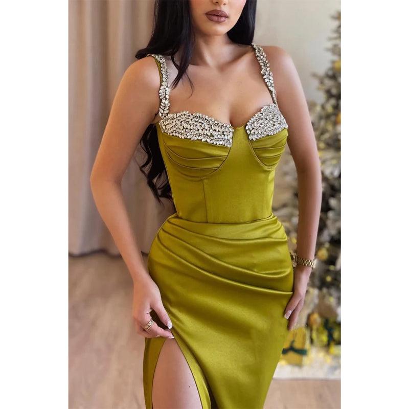 Vestido de noche para fiesta de graduación con escote en forma de corazón, tirantes finos, pliegues de cuentas y abertura lateral