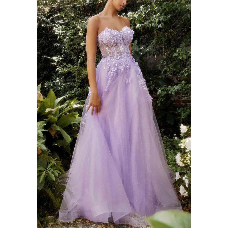 Vestido de noche largo de fiesta de tul transparente con apliques y escote en forma de A, sin tirantes y escote corazón