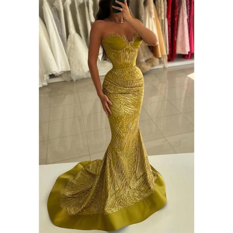 Vestido de noche largo estilo imperio, sin tirantes, con escote corazón y fruncido, con apliques