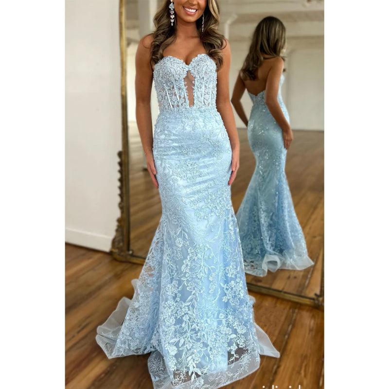 Vestido de noche para fiesta de graduación con apliques de encaje y corte trompeta sin tirantes y escote corazón