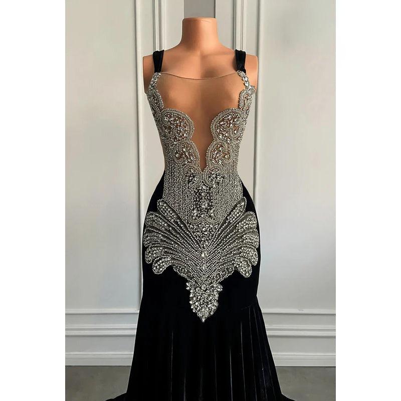 Vestido de fiesta de noche con escote en V, tirantes finos, volantes y pedrería, corte sirena/trompeta