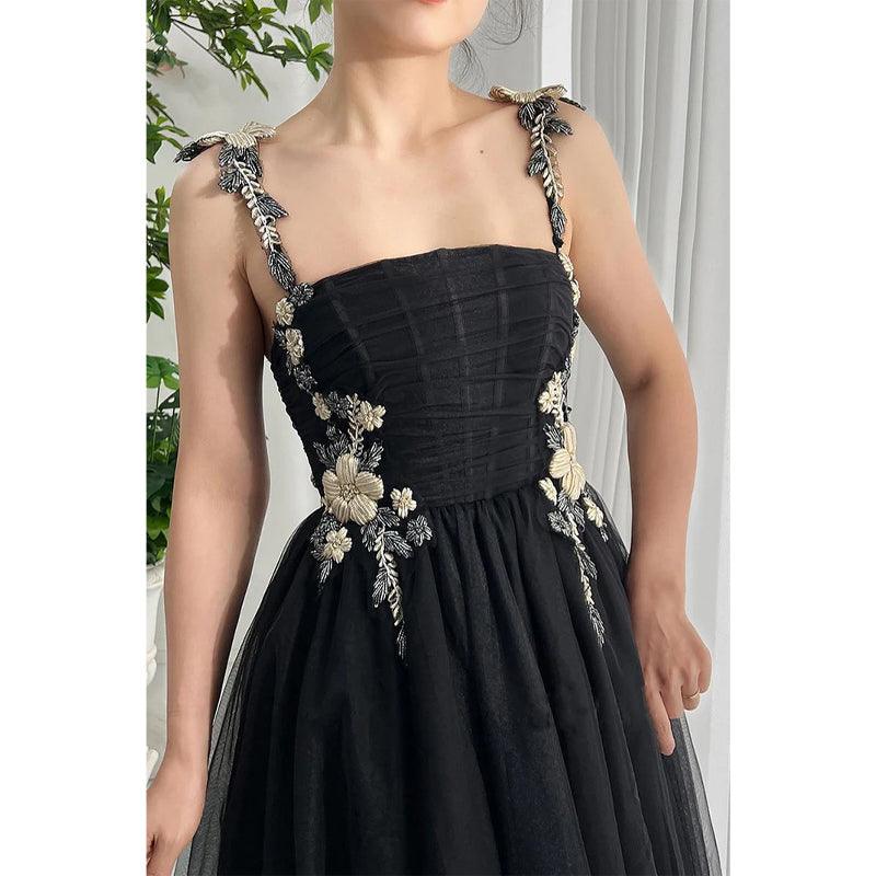 Vestido de noche de fiesta con apliques florales y tirantes finos de tul en forma de A