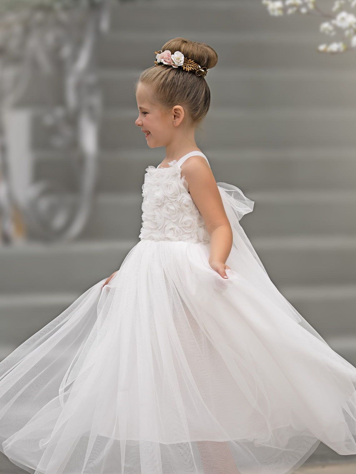 Vestido de bebé niña con lazo de tul y aplique floral en 3D de la colección Jardín Encantado