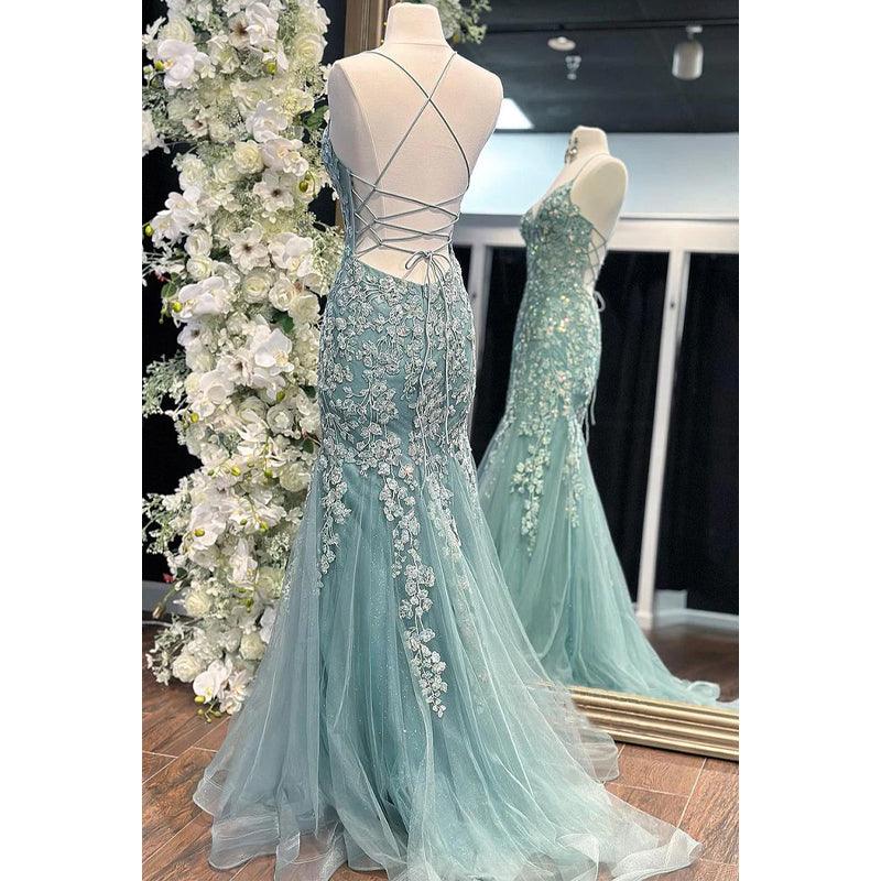 Vestido formal de tul con escote en V, tirantes finos, apliques de encaje y cola de tul