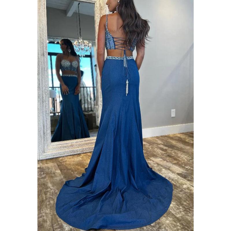 Vestido de fiesta de graduación de dos piezas con tirantes finos y cola, con cuentas