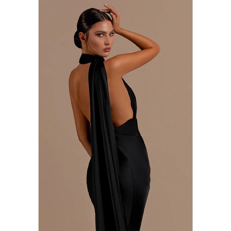 Vestido de fiesta formal largo negro con pliegues y cuello halter único