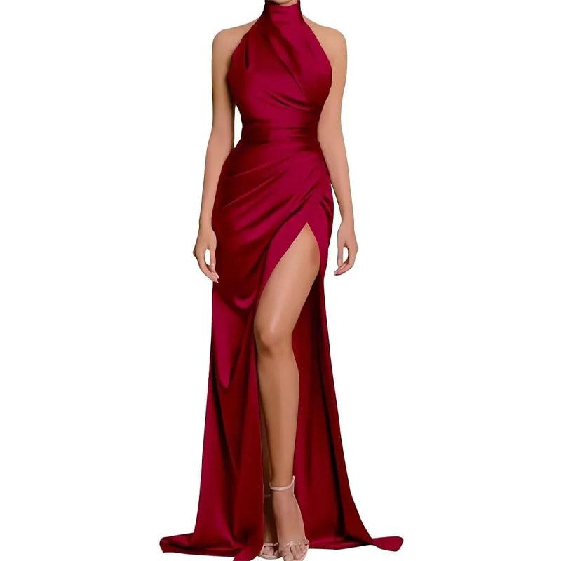 Vestido formal de fiesta largo con escote alto, pliegues y abertura alta