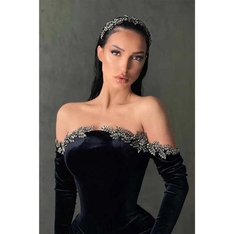 Vestido de noche formal de terciopelo negro con hombros descubiertos, mangas largas y abertura