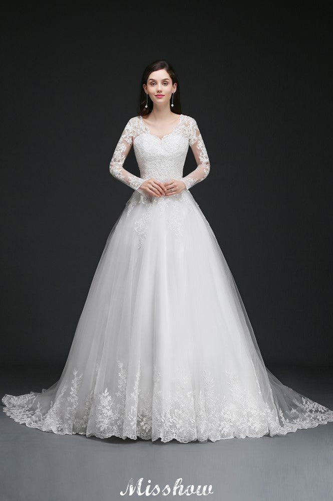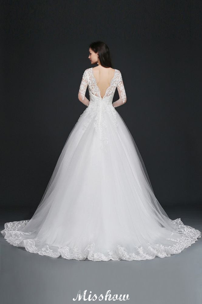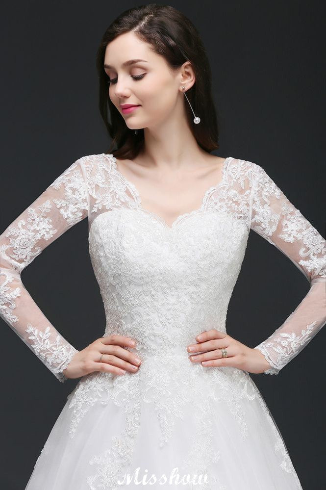 Catálogo: Vestidos de novia Código del artículo: B150960718648753 Lugares: Iglesia Detalles de la espalda: Cremallera Temporada: Primavera.Verano.Otoño.Invierno Escote: Escote en V Material: Tul Silueta: Vestido de baile Tipo de cuerpo: Señorita Tren: Tren de la capilla Largo de manga: Manga larga Cintura: Natural Largo del dobladillo: Hasta el suelo Adornos: Apliques