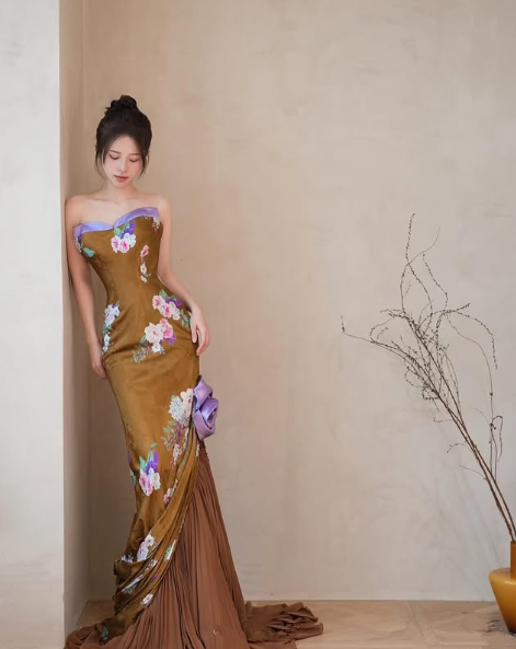 Vestido de noche sirena de satén estampado vintage, sin tirantes, largo para baile de graduación Y8545