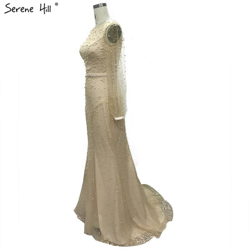 Vestido de noche estilo sirena con perlas blancas y manga larga, diseño Dubái 2025, cuello redondo, sexy, de tul, LA60995