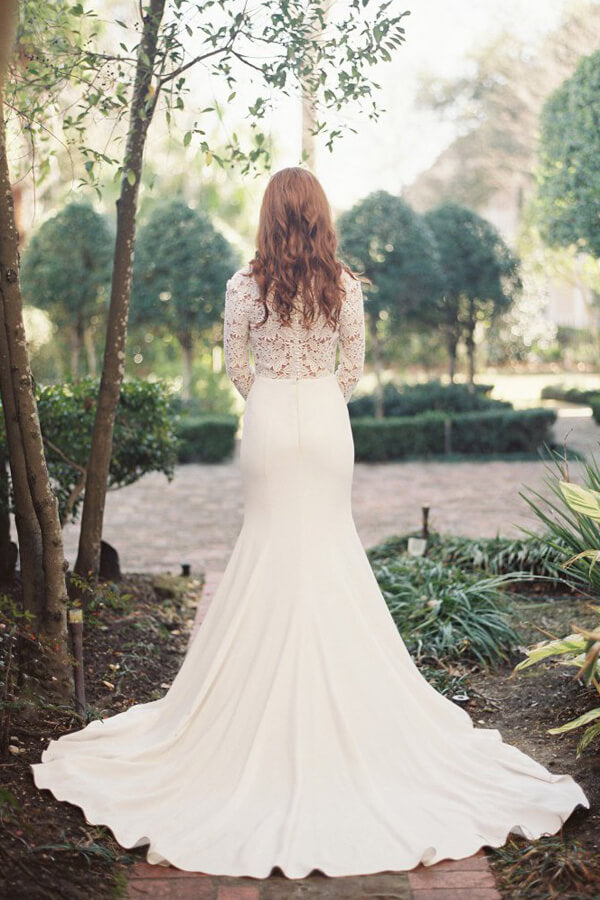 Vestido de novia Baoleely blanco de sirena, escote en V profundo, manga larga y encaje, MW195