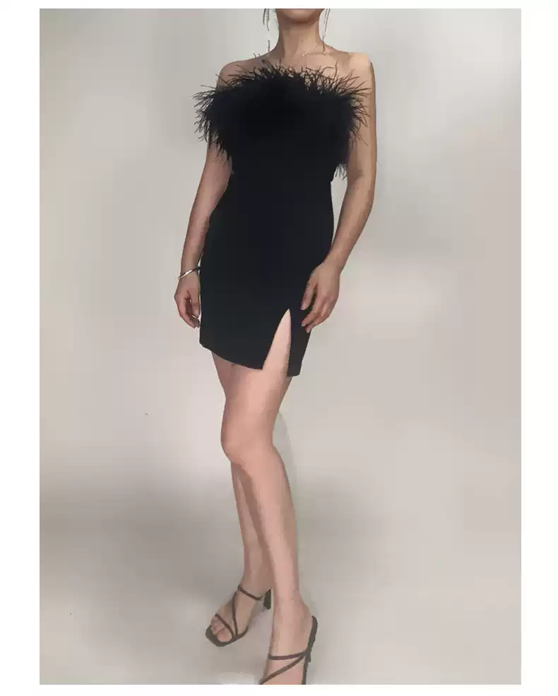 Vestido ajustado negro corto de fiesta de bienvenida con hombros descubiertos y escote con plumas para mujer Y1356