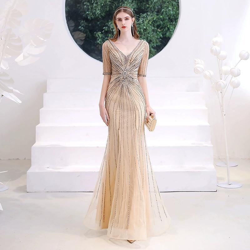 Vestido de noche de sirena para mujer, vestido largo de fiesta con escote en V y vestido formal con cuentas