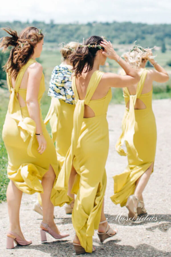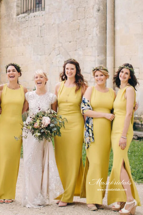 Vestidos de dama de honor amarillos de satén, corte sirena, estilo barco, largos hasta el suelo, con abertura. MBD269