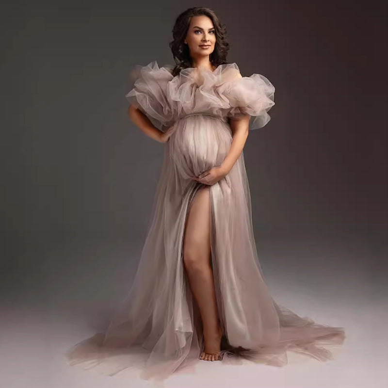 Robe de soirée en tulle à une épaule dénudée fendue, idéale pour les femmes enceintes et mettant en valeur leur ventre rond.