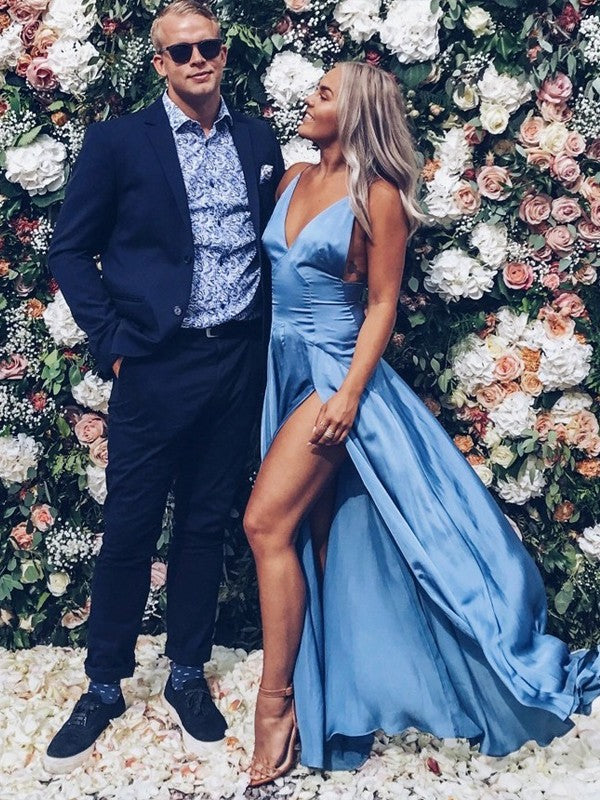 Robes de bal élégantes en satin, coupe trapèze/col en V, sans manches, longueur au sol, à volants, col en V