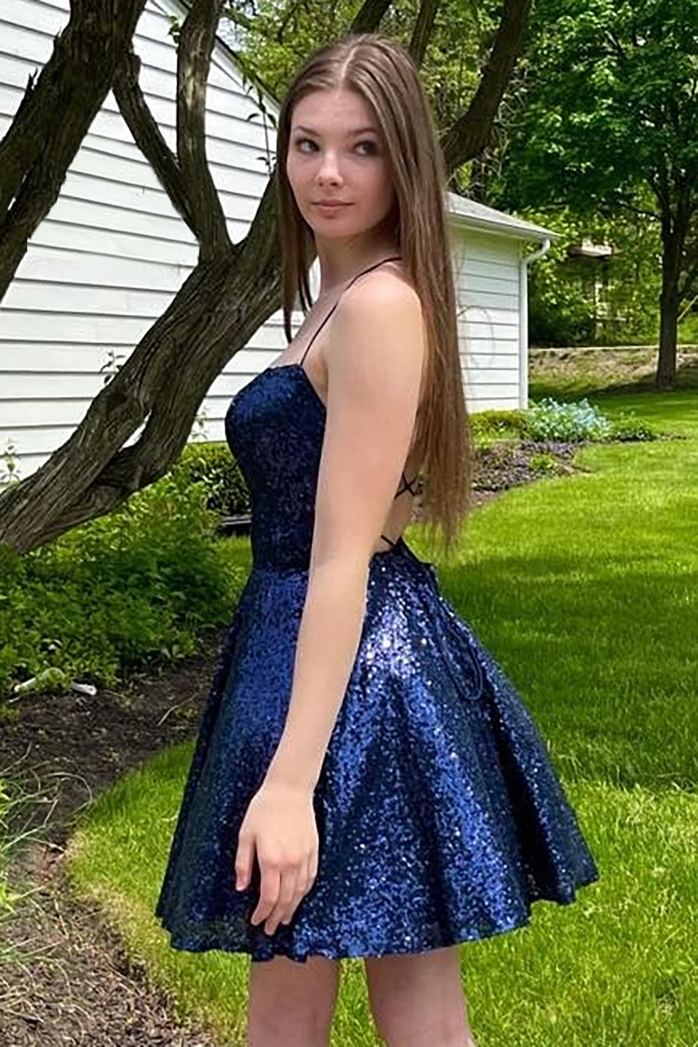 Robe courte de bal bleu marine à sequins, coupe trapèze, dos nu et bretelles croisées.