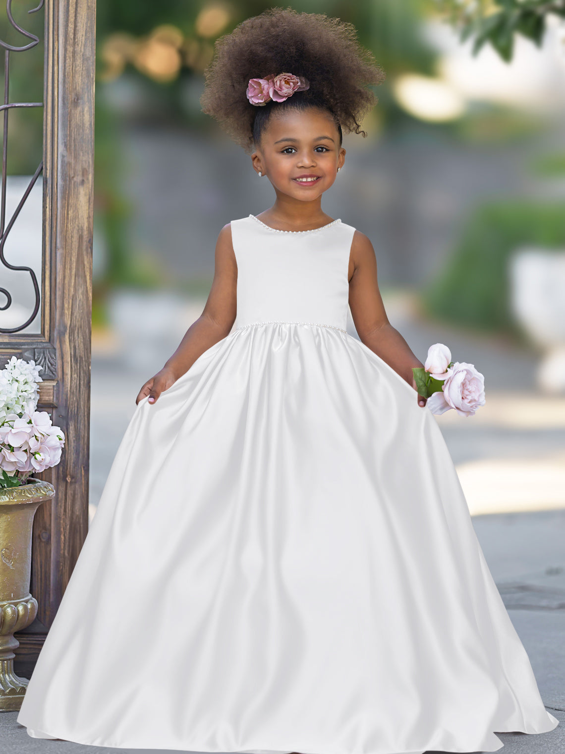 Robe sans manches en satin ornée de perles et d'un nœud, avec encolure perlée et détail de nœud.