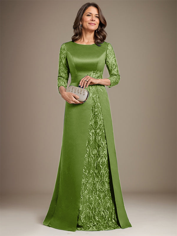 Robe de mère de la mariée en satin de dentelle, coupe trapèze, longue jusqu'au sol, ornée d'appliqués, avec décolleté plongeant et bretelles.