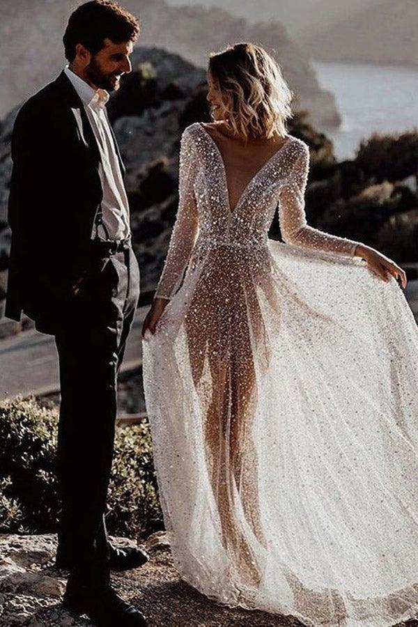Sublimez votre journée avec cette robe de mariée d'exception. Son corsage transparent orné de manches longues et d'un décolleté en V plongeant en fait la robe idéale pour la mariée moderne en quête d'élégance intemporelle. Les sequins scintillants apportent une touche de glamour et vous font rayonner.