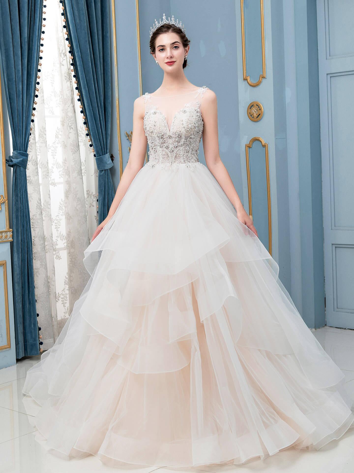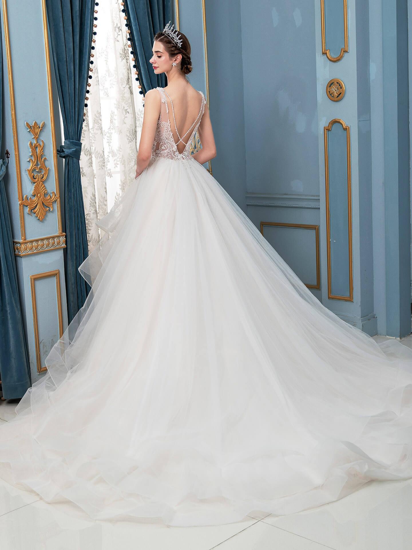 Robe de mariée trapèze en tulle, col en V, perles, sans manches, longueur au sol