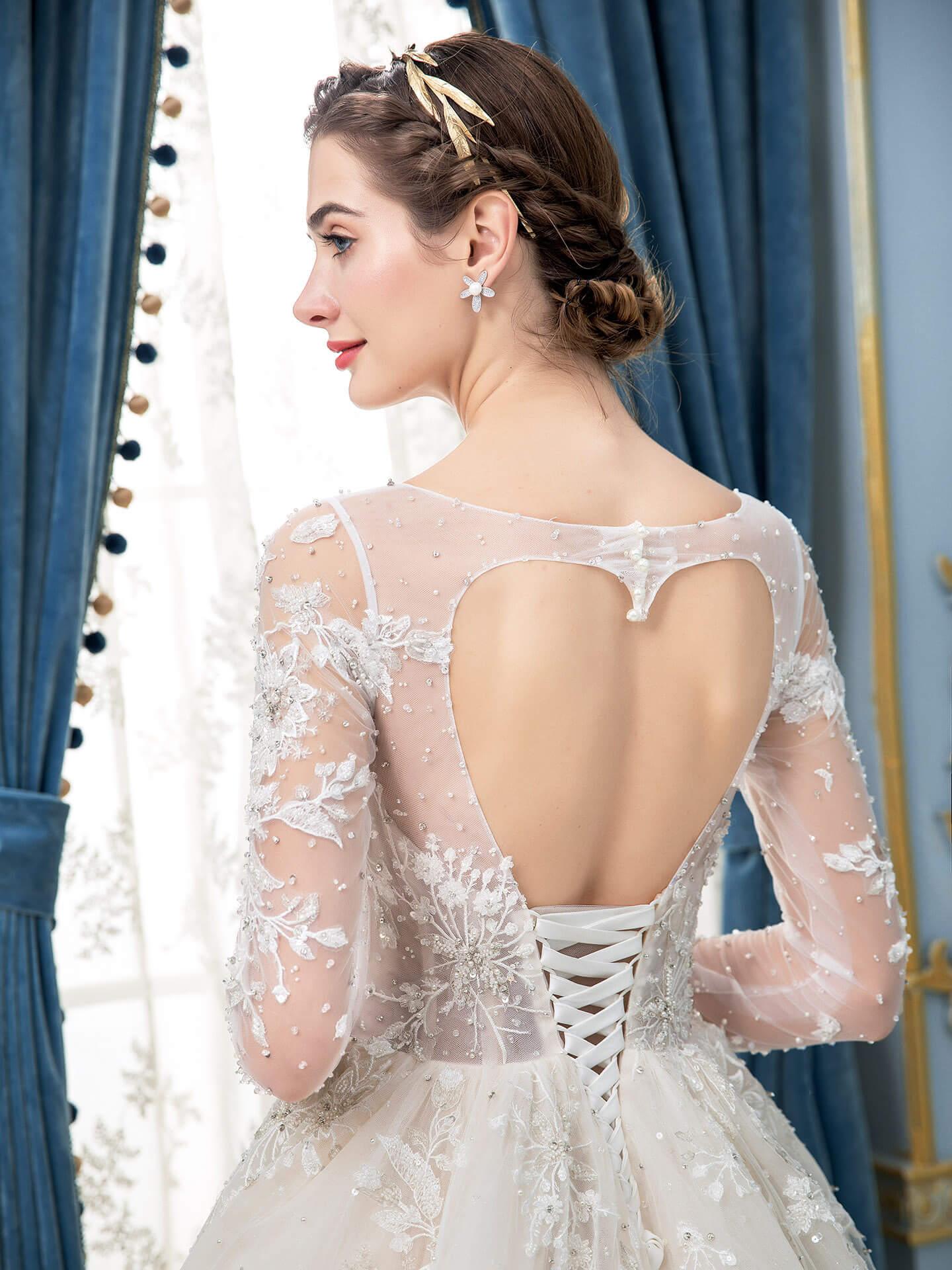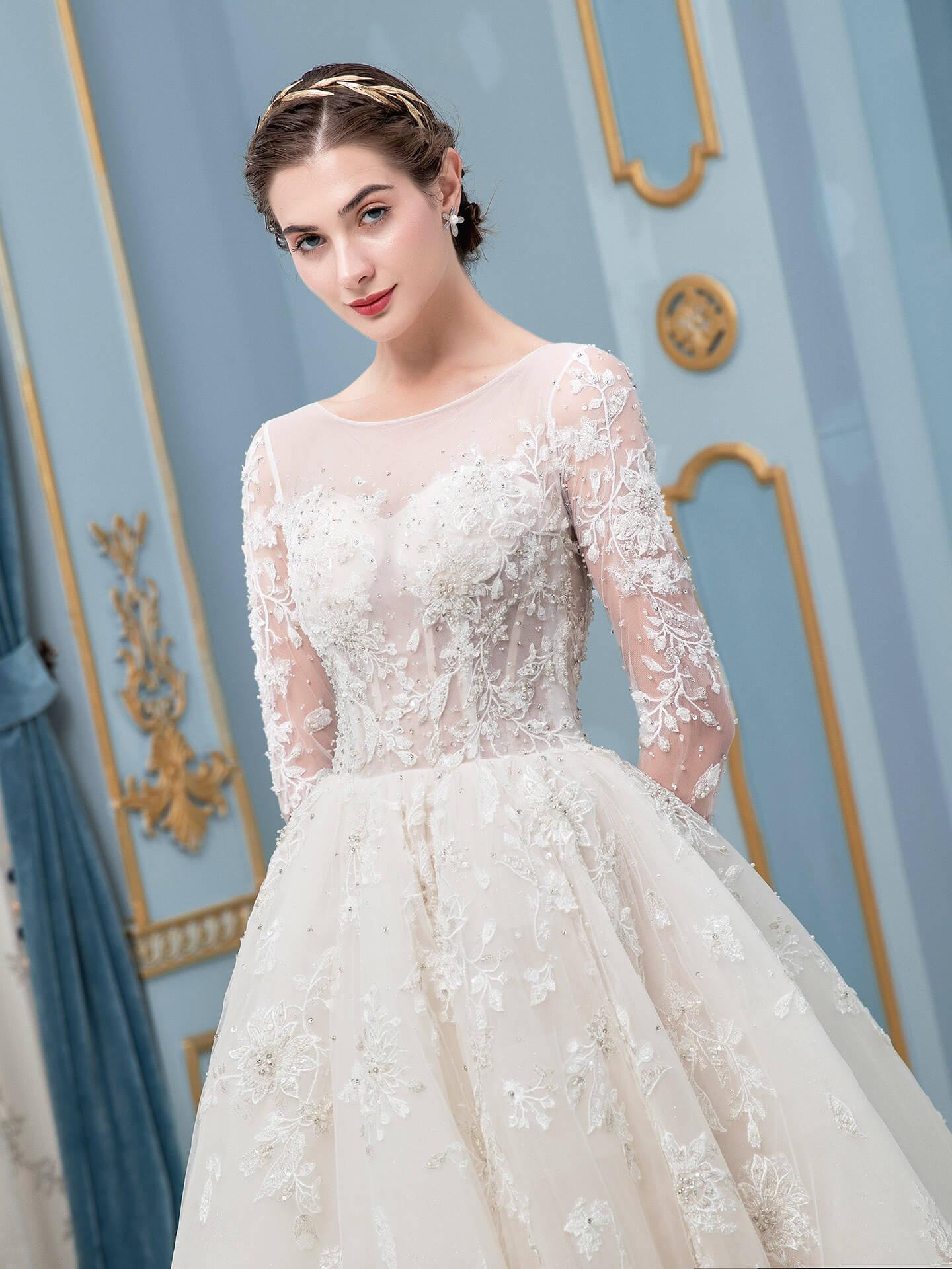 Robe de mariée trapèze en tulle, dentelle, appliques et perles, longue, sans manches, longueur au sol