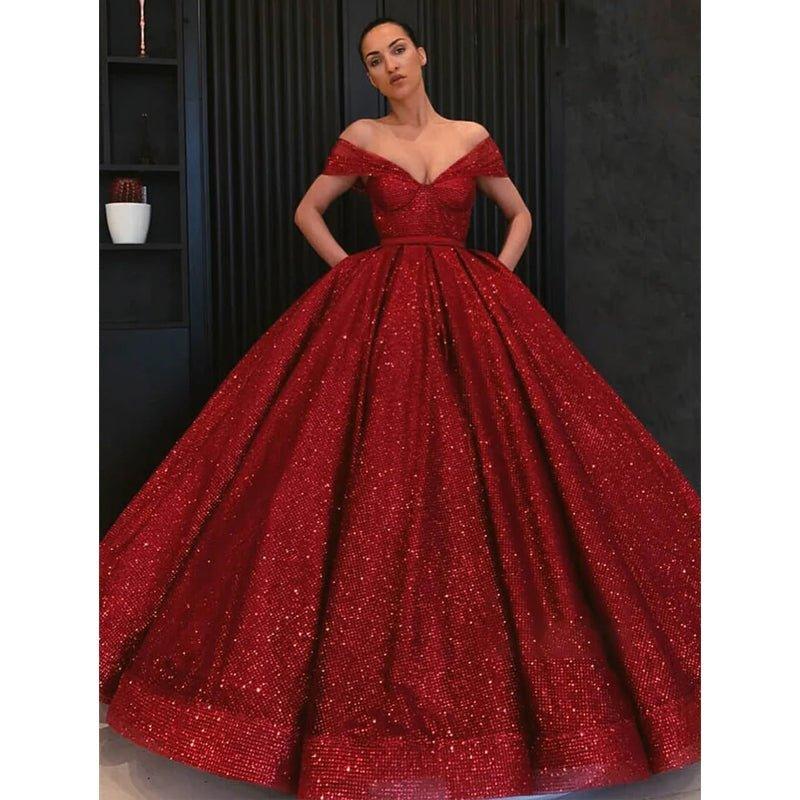 Robe de soirée longue bordeaux à paillettes, épaules dénudées