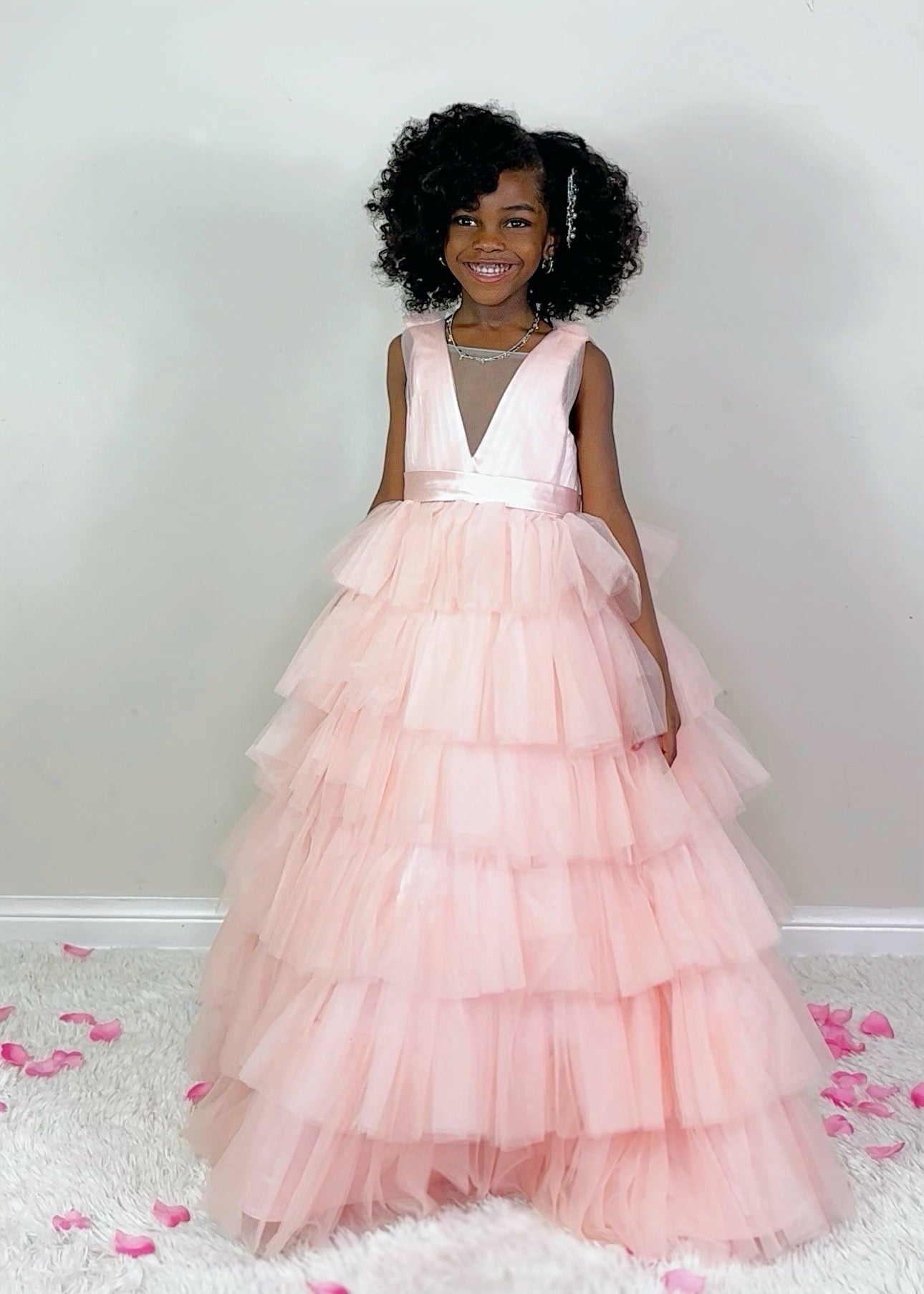 Robe de bal/robe de princesse rose perle sans manches en tulle avec nœud pour demoiselle d'honneur