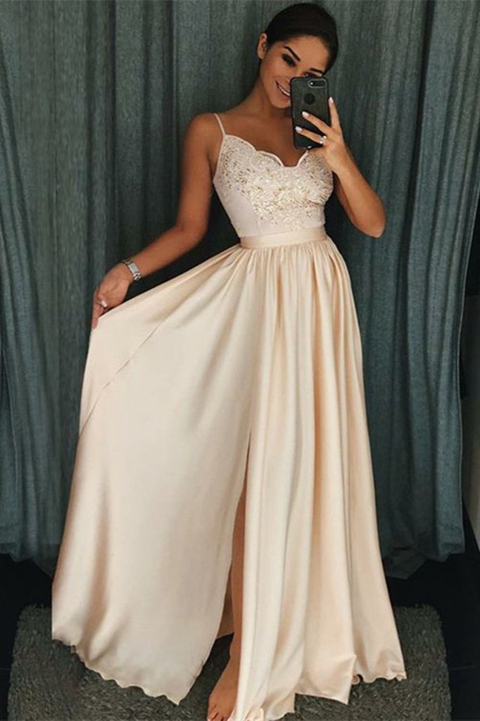 Magnifique robe de bal longue à fines bretelles, ornée d'appliqués de dentelle et fendue.