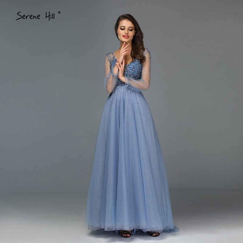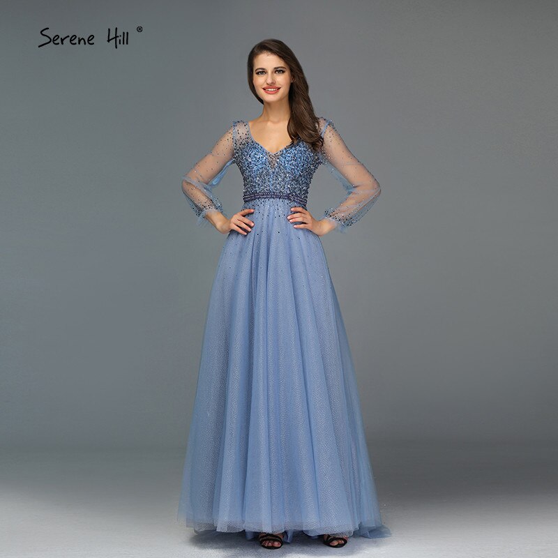 Blau Langen Ärmeln A-Line Abend Dressese Design 2025 V-ausschnitt Perlen Kristall Abendkleider Lange LA70143