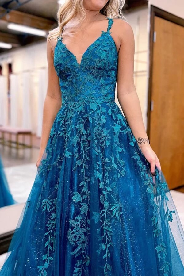 1. Tissu : Tulle 2. Silhouette : Ligne A 3. Encolure : Col en V 4. Embellissement : appliques en dentelle. 5. Tour de taille : Naturel 6. Manches : Sans manches 7. Styles de dos : à lacets 8. Longueur de l'ourlet : Longueur au sol 9. Entièrement doublé : Oui 10. Soutien-gorge intégré : Oui 11. Couleur de l'image : Bleu (Pour les couleurs personnalisées, veuillez consulter notre nuancier et laisser une note)