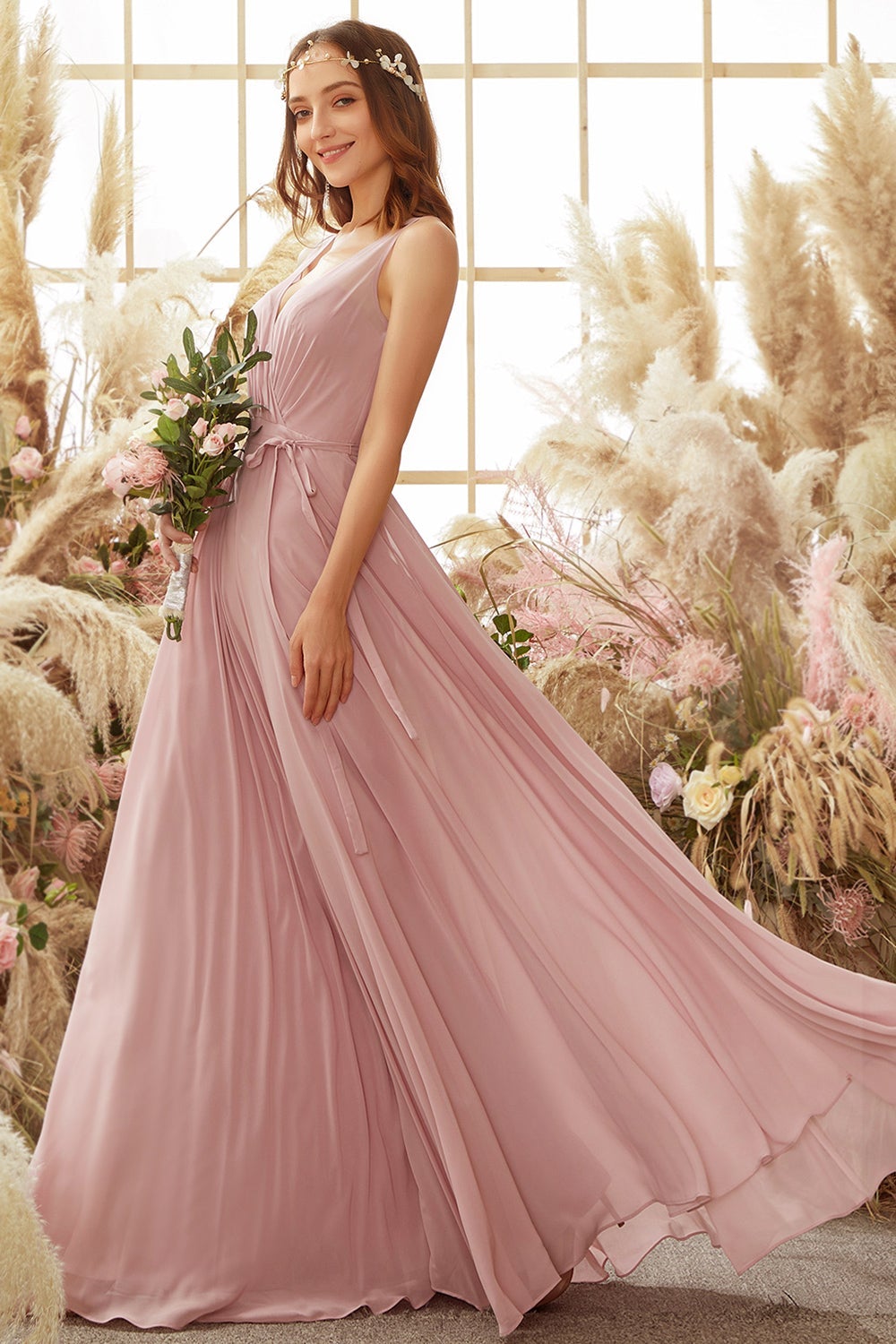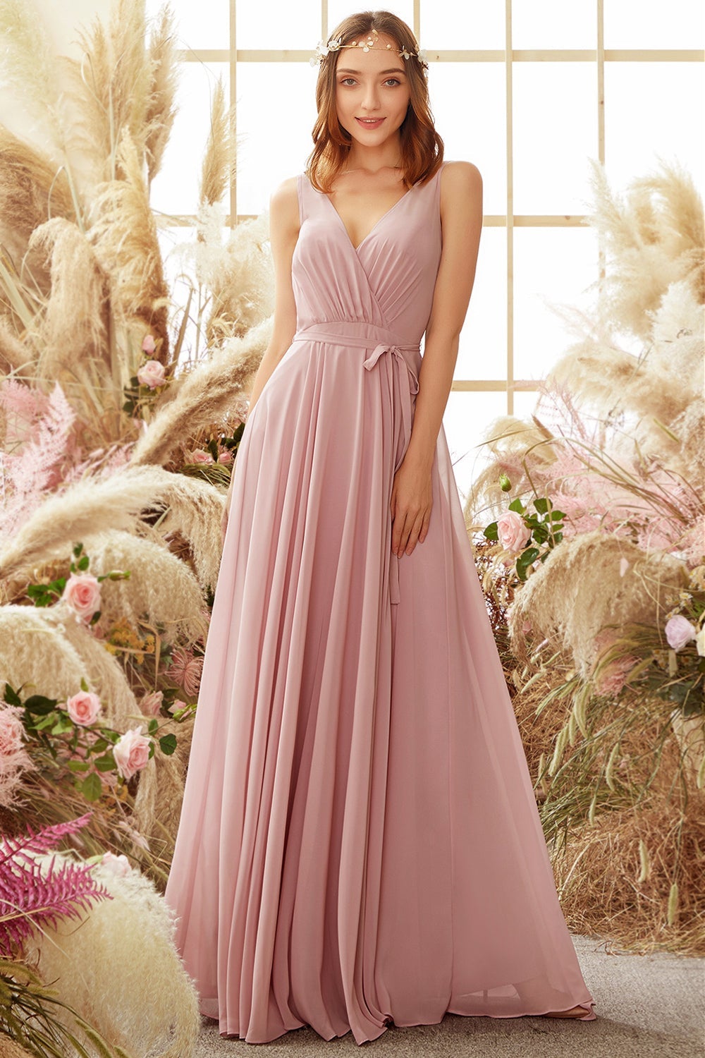Robe de demoiselle d'honneur longue en mousseline rose poudré à col en V