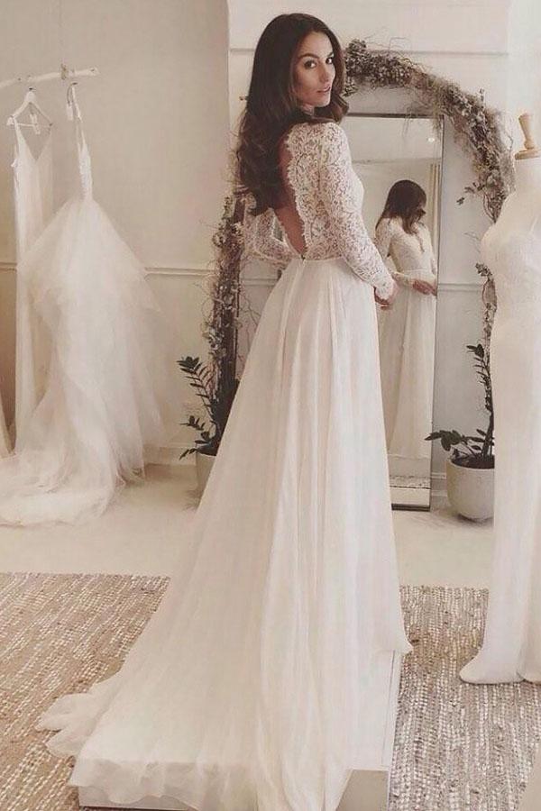 Robes de mariée longues formelles charmantes et abordables en mousseline à manches longues et col en V