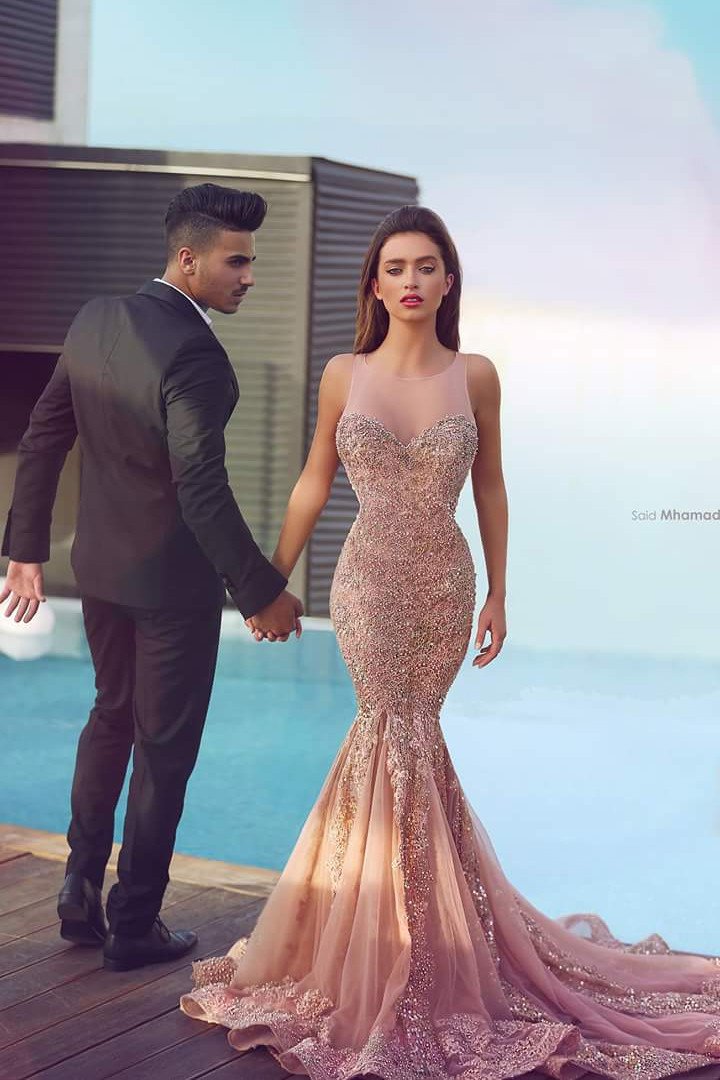 Robe de bal longue sirène rose poudré, ornée d'appliques et de perles, avec un décolleté en cœur.