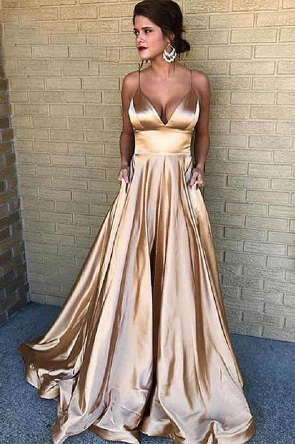 Robes de bal pas chères, bretelles spaghetti, robes de soirée longues avec poches.