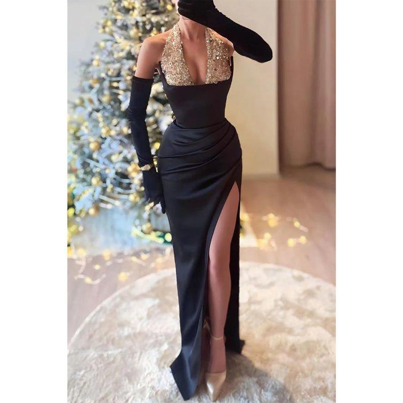 Robe de soirée chic ajustée à col licou, plissée empire, avec fente latérale et paillettes