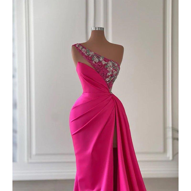 Robe de bal chic et moderne, asymétrique, sans manches, fourreau froncé, ornée de perles