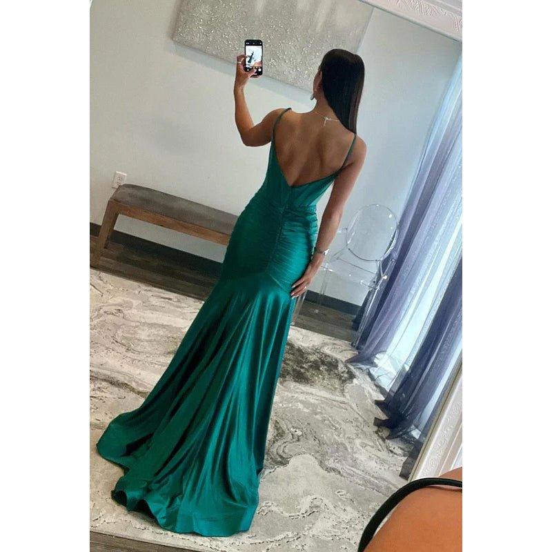 Robe de bal de fin d'année chic et moderne à bretelles spaghetti et fente latérale dos nu style trompette