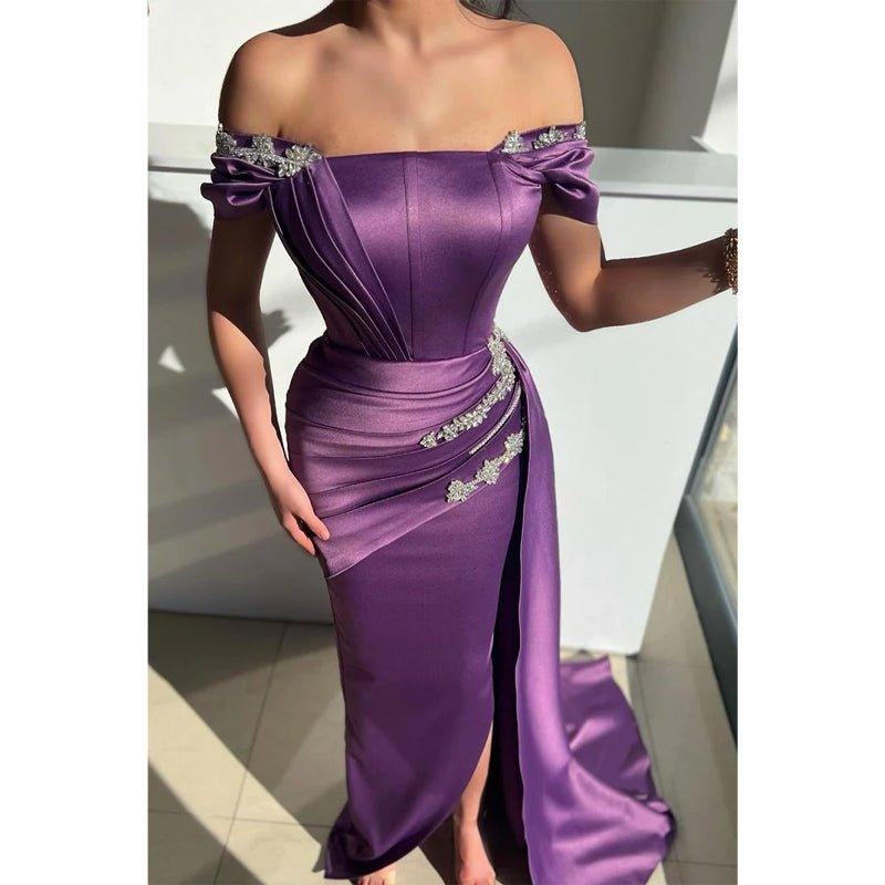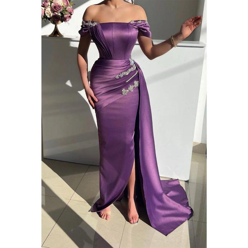 Robe de soirée sirène chic à épaules dénudées et perles en satin avec fente
